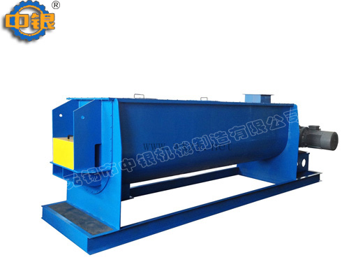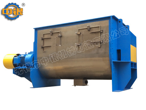 臥式螺帶混合機以高效、快速混合物料、由攪拌軸的螺旋帶運動下,使內外螺旋帶在較大范圍內翻動物料,內螺旋帶將物料向兩側運動,外螺旋帶將物料由兩側向內運動,使物料來回滲混,另部分物料被螺旋帶推動下,沒軸向徑向運動,從而形成對流循環。由于上述運動的攪拌,物料在較短時間內獲得快速均勻混合。